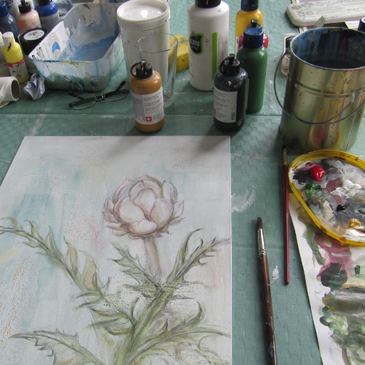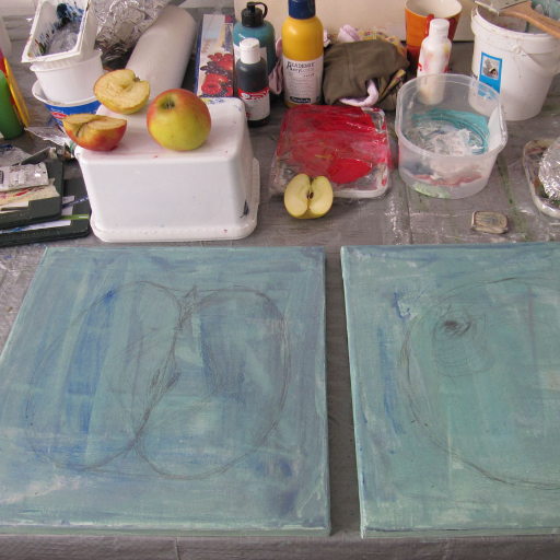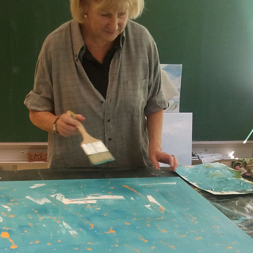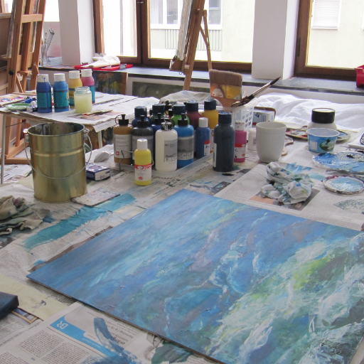 Hauptsächlich verwende ich Acrylfarben, experimentiere aber auch mit Sand, Asche, Spachtelmasse, Tusche und Kreide.
